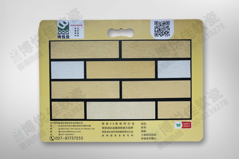 湖北博悅佳實業有限公司(www.lx139.com)專業生產軟瓷、劈開磚、外墻磚、仿古磚、柔性飾面磚等特色產品,是集生產、施工和修復為一體的專業化公司,在高層建筑,別墅,豪宅,仿古建筑等領域倍受好評。產品低碳、節能、環保,具有耐高溫、耐腐蝕、抗凍強、抗剝落等特點,遠銷海外。軟瓷產品及施工歡迎咨詢博悅佳:18071719278 、400-013-9278。